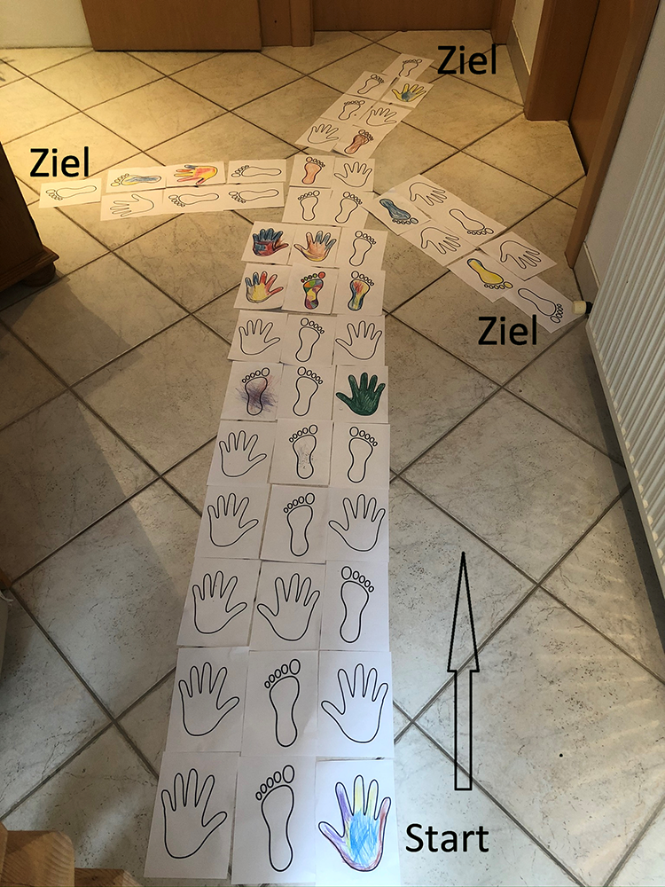 Nun markierst du mit den Gegenständen auf einer größeren, glatten Oberfläche einen „Start“ und ein „Ziel“.